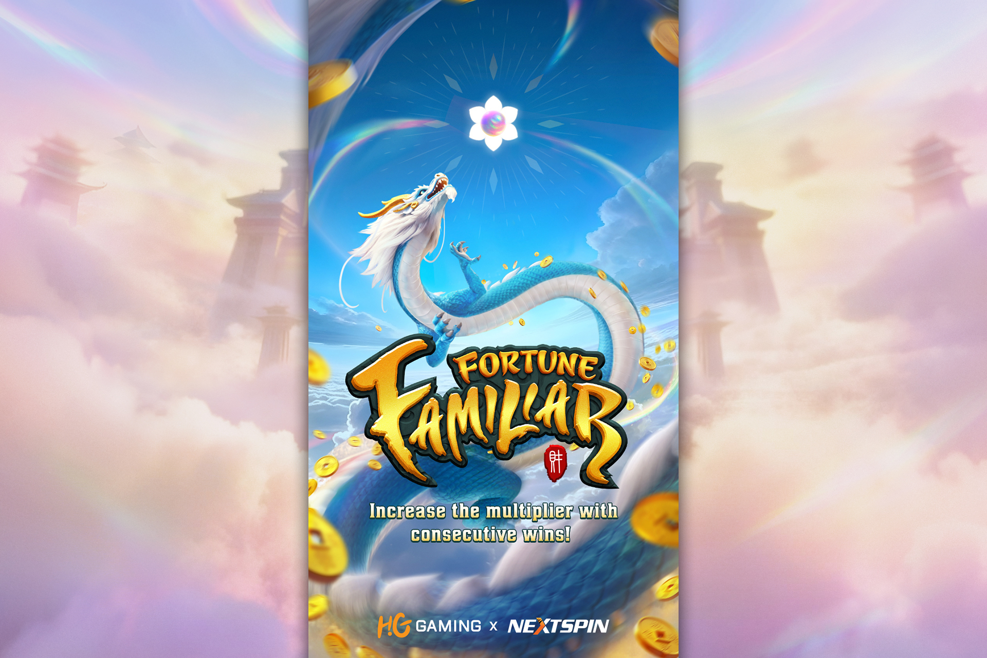 Fortune Familiar is an enchanting game experience that transports you to the heart of ancient Chinese celestial legend, where celestial dragon guard heaven’s greatest treasures. Partner and bond with a majestic Spirit Dragon and traverse 20 magical paylines that serve as magical pathways to prosperity. The core of the adventure is summoning the mighty Spirit Dragon - landing 3 Scatters (East Gate of Heaven) triggers an epic animation where the Spirit Dragon leaps into the sky and ascend to the East Gate of Heaven, triggering the Free Spins round where a roaring win multiplied up to 15x awaits. Every element, from the Dragon Jade symbols to the Gold Ingot icons, works in harmony to create an immersive experience where you don’t just play the game – you command the fury of heaven.